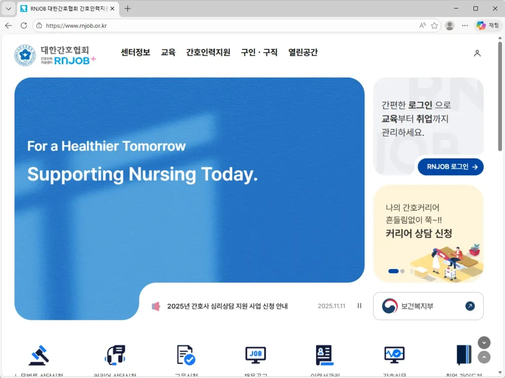 그런 여러분을 위해 보건복지부와 대한간호협회가 운영하는 가장 든든한 지원군, 간호인력취업교육센터 ([www.rnjob.or.kr)를소개합니다.