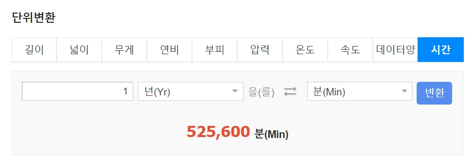 (일반 연도: 365일 × 24시간 × 60분 = 525,600분 / 윤년: 366일 × 24시간 × 60분 = 527,040분)